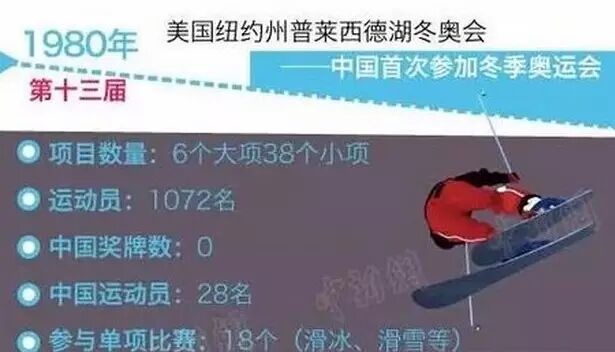 1:1980年第13屆冬奧會:中國第一次參加冬奧會,首秀28名運動員